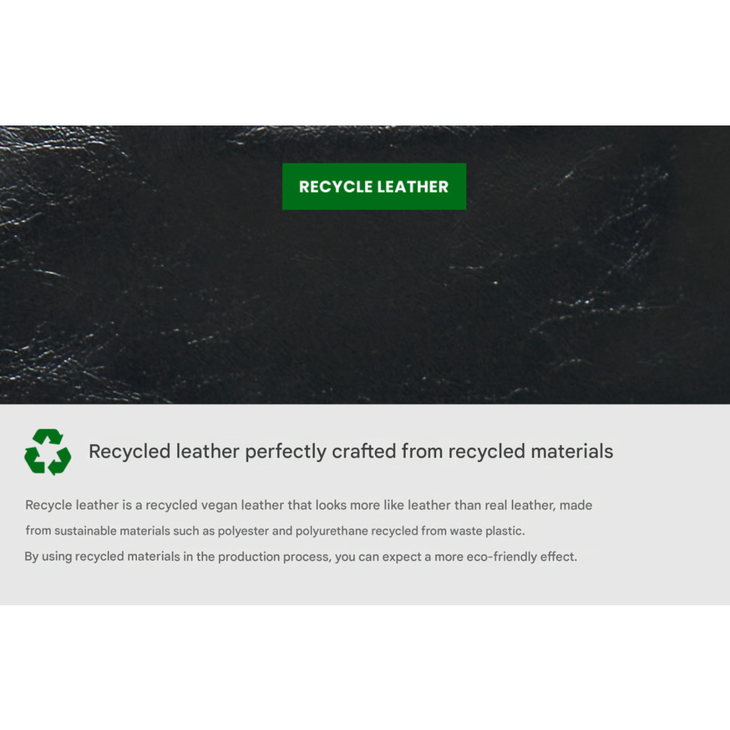 Recycle leather is a recycled vegan leather that looks more like leather than real leather, made from sustainable materials such as polyester and polyurethane recycled from waste plastic.